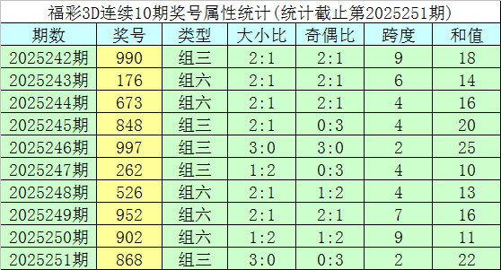 开奖转头:福彩3D第2025251期奖号为868。奖号样貌为组三,大小样貌为大大大,奇偶样貌为偶偶偶,和值为22,跨度为2。
